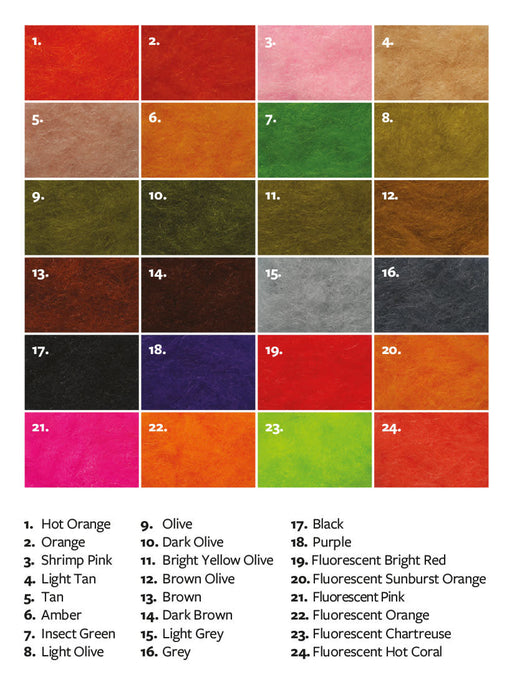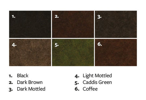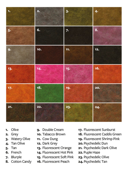 Ultra Nymph dubbing is a uniquely blended dubbing of natural synthetic fibres that provide a soft and translucent appearance. This dubbing takes your nymph patterns to the next level. A blend of of two natural fibres and two different synthetics One of the synthetics adds a unique, subtle sparkle to your flies. Expertly dyed and blended to give you a truly unique dubbing not found anywhere else 24 colours in the range A multi-purpose dubbing, probably most suited to Euro style nymphs and shrimp type patterns. We have also included some psychedelic colours in the range which at first glance look muted but when you put a torch on them they really pop, these have been particularly effective for us 1 gram per pack