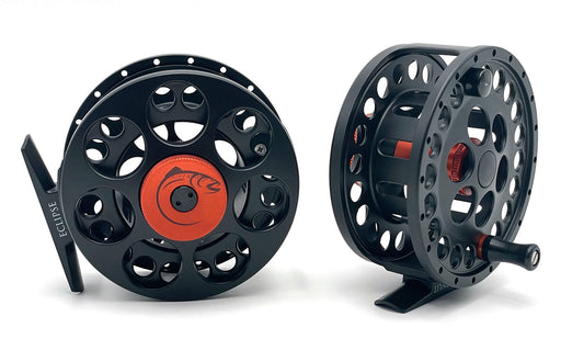 Moonlit Eclipse Machined Die Cast Reel High Quality Made in Korea The Eclipse Reels are a machined die-cast reel with a smooth, sealed, drag system that consists of stainless steel and carbon discs. The drag one turn adjustment knob is also fully machined. These reels have more than enough room to take backing with any suitable fly line. With all this the Eclipse gives you the highest performing reel for a real value that will put your mind at ease. Pick from the two different color choices of Light Olive/Matte Black or Burnt Orange/Matte Black. Fly Reel Features Quick and Easy pop out spool release Drag adjustment and housing are CNC -machined Effortless and easy fast 360 drag adjustment Carbon disc Made in the USA High quality ball bearings made in Japan Fly Reel Specs Line Spool Diameter Arbor Diameter Weight Capacity #3-4 2.95in (75mm) 4.27oz WF3 + 40yds 20lb Backing #5-6 3.34in (85mm) 4.87oz WF5 + 98yds 20lb Backing #7-8 3.74in (95mm) 6.24oz WF7 + 164 20lb Backing