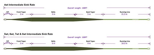 Sale $40 saving $25 Floating Sink Tip Fly Line Dark Olive Head/Olive Running Line These lines are designed and made with a floating line and integrated sink tip with varying sink rates so you can fine tune it with your application. Each sink rate will allow you to fish at different depths, with different flies, and better target specific species of fish, or types of water. Each different Sink Tip is color coordinated so if you have multiple tips you can tell which is which based off of color. If you forget, the lines are also laser engraved to help you identify your line as well. It is constructed with a PVC coating, and a 25lb low stretch braided core. This gives this line the a slick coating for smooth casting, and performance. The low stretch is important for strike detection. These lines all come in a 4wt through 8wt Sink Tip Features The Intermediate is a S1 Sink rate or 1.5 to 2.5 ips (fishing depth of 1-2 feet). This is ideal for fishing for trout, bass, or panfish over shallow beds. Dark Olive Head/Olive Running Line Line Specs Medium S1 Line 4wt Head length 30 ft Line Length 100 ft Head Weight 136 gr (8.8 gm) Sink Rate 1.5-2.5 ips Medium S1 5wt Head length 39 ft Line Length 100 ft Head Weight 159 gr (10.3 gm) Sink Rate 1.5-2.5 ips Medium S1 6wt Head length 39 ft Line Length 100 ft Head Weight 183gr (11.8gm) Sink Rate 1.5-2.5 ips Medium S1 7wt Head length 39 ft Line Length 100 ft Head Weight 205 gr (13.3 gm) Sink Rate1.5-2.5 ips Medium S1 8wt Head length 39 ft Line Length 100 ft Head Weight 235 gr (15.2 gm) Sink Rate 1.5-2.5 ips Leader Recommendations This fly line is designed to sink and get a fly into a particular zone of the feeding column and or depth of water to present and drift the fly as effectively as possible. Since this line is designed for shallower waters and slower sink rates a longer leader can be more effective. We love this line for small to medium size streamers, nymphs, and soft hackle-wet flies. Our go-to leader for this is the Moonlit Big Hog Leader, 7-9 ft of straight fluorocarbon, or tapered fluorocarbon leader in the 7 1/2-9 ft length. With a slower sink rate, you can still get a uniform sink rate with a longer leader. Casting Sink Tip Fly Line and Technique
