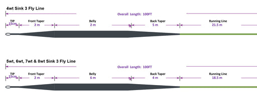 Sale $40 saving $25 Floating Sink Tip Fly Line Grey Head/Olive Running Line These lines are designed and made with a floating line and integrated sink tip with varying sin rates so you can fine tune it with your application. Each sink rate will allow you to fish at different depths, with different flies, and better target specific species of fish, or types of water. Each different Sink Tip is color coordinated so if you have multiple tips you can tell which is which based off of color. If you forget, the lines are also laser engraved to help you identify your line as well. It is constructed with a PVC coating, and a 25lb low stretch braided core. This gives this line the a slick coating for smooth casting, and performance. The low stretch is important for strike detection. These lines all come in a 4wt through 8wt Sink Tip Features The S3 Tip has a sink rate of 2.5-4.0ips (fishing depth of 3-7 feet). This line will help get your fly into the fishes feeding zone quickly, effectively, and uniformly. Grey Head/Olive Running Line Line Specs Medium S3 Line 4wt Head length 30 ft Line Length 100 ft Head Weight 147 gr (9.5 gm) Sink Rate 2.5-4.0 ips Medium S3 5wt Head length 39 ft Line Length 100 ft Head Weight 173 gr (11.2 gm) Sink Rate 2.5-4.0 ips Medium S3 6wt Head length 39 ft Line Length 100 ft Head Weight 193gr (12.5 gm) Sink Rate 2.5-4.0 ips Medium S3 7wt Head length 39 ft Line Length 100 ft Head Weight 219 gr (14.2 gm) Sink Rate 2.5-4.0 ips Medium S3 8wt Head length 39 ft Line Length 100 ft Head Weight 250 gr (16.2 gm) Sink Rate 2.5-4.0 ips Leader Recommendations When fishing with this line it is important to pair the proper leader setup. Having the proper setup will ensure the greatest amount of success. When you are trying to get your fly down into the feeding zone quickly you want to use a shorter leader. We recommend using the Moonlit HOGzilla Leader for fishing streamers, and or nymphs. It is made of fluorocarbon with a reinforced core, and its short length will give you a good uniform sink between fly, leader, and line. If you are swinging wet flies and soft hackles, and nymphs I would recommend the Moonlit Big Hog Leader, constructed of polyester thread and fluorocarbon core. Its length and core make it a perfect pair for utilizing the sink tip to help get your fly into the feeding zone with accuracy, precision, control, and effectiveness. You can use a straight 5-7 ft of straight fluorocarbon line as your leader as well, or a tapered fluorocarbon leader no longer than 7 1/2 ft leader. Fly Casting Sink Tip Fly Lines/Techniques