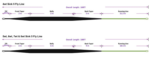 Sale $40 saving $25 Floating Fast S5 Sink Tip Fly Line Black Head/Olive running line These lines are designed and made with a floating line and integrated sink tip with varying sin rates so you can fine tune it with your application. Each sink rate will allow you to fish at different depths, with different flies, and better target specific species of fish, or types of water. Each different Sink Tip is color coordinated so if you have multiple tips you can tell which is which based off of color. If you forget, the lines are also laser engraved to help you identify your line as well. It is constructed with a PVC coating, and a 25lb low stretch braided core. This gives this line the a slick coating for smooth casting, and performance. The low stretch is important for strike detection. These lines all come in a 4wt through 8wt Sink Tip Features The S5 Tip has a 4.5-6.0 ips ( fishing depth of 15-20 feet) This is the ideal line to use when fishing deep lakes, or fast moving bodies of water. Black Head/Olive running line Line Specs Fast S5 Line 4wt Head length 30 ft Line Length 100 ft Head Weight 173 gr (11.2 gm) Sink Rate 4.5-6.0 ips Fast S5 5wt Head length 39 ft Line Length 100 ft Head Weight 193 gr (12.5 gm) Sink Rate 4.5-6.0 ips Fast S5 6wt Head length 39 ft Line Length 100 ft Head Weight 219 gr (14.2 gm) Sink Rate 4.5-6.0 ips Fast S5 7wt Head length 39 ft Line Length 100 ft Head Weight 250 gr (16.2 gm) Sink Rate 4.5-6.0 ips Fast S5 8wt Head length 39 ft Line Length 100 ft Head Weight 290 gr (18.8 gm) Sink Rate 4.5-6.0 ips Leader Recommendations When fishing with this line it is important to pair the proper leader setup. Having the proper setup will ensure the greatest amount of success. When you are trying to get your fly down into the feeding zone quickly you want to use a shorter leader. We recommend using the Moonlit HOGzilla Leader. It is made of fluorocarbon with a reinforced core, and its short length will give you a good uniform sink between fly, leader, and line. You can use a straight 5-7 ft of straight fluorocarbon line as your leader as well, or a tapered fluorocarbon leader no longer than 7 1/2 ft leader. Casting Sink Tip Fly Lines/Techniques