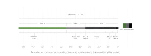 This is a fully tapered sinking line, so it casts like a floater, but provides a straight-line sinking connection to your streamer. The days of chucking and ducking are finally over. Welcome to the triple-density revolution. Loads quickly and delivers the biggest flies to the furthest targets Excellent turnover due to short, powerful head Triple density construction provides straight-line connection to fly Shooting Texture reduces friction, providing longer casts, easier pick-up, and increased durability For temperate climates Braided multifilament core Sink Rates: Sink 3 = 2.5 – 3.5 ips | Sink 5 = 4.5 – 6.0 ips | Sink 7 = 7.0 – 8.0 ips ITEM NUMBER LINE WEIGHT HEAD LENGTH TOTAL LENGTH GRAIN WEIGHT* 126298 WF-8-S 33.5’ / 10,2m 105.0’ / 32,0m 280gr / 18,1g 126304 WF-9-S 33.5’ / 10,2m 105.0’ / 32,0m 330gr / 21,4g 126311 WF-10-S 33.5’ / 10,2m 105.0’ / 32,0m 380gr / 24,6g 126328 WF-11-S 33.5’ / 10,2m 105.0’ / 32,0m 450gr / 29,2g 126144 WF-12-S 33.5’ / 10,2m 105.0’ / 32,0m 500gr / 32,4g