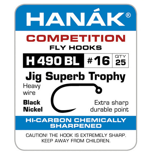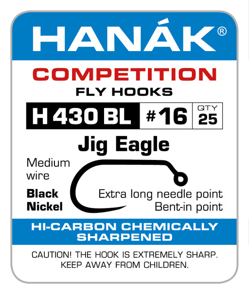 Hanák H430BL Jig Eagle Hooks - Euro-nymphing hooks Hanák H430BL Jig Eagle Hooks – The new 2024 release! These jig hooks are a modified version of the proven H230BL model, now featuring a slightly inward-bent needle-point tip for improved hook-ups and holding power. Perfect for tying jig-style nymphs and streamers, they are an essential addition to your fly-tying arsenal. Key Features: Slightly inward-bent point: Ensures secure hooking and better performance. Jig-style design: Ideal for modern Euro-nymphing techniques. Durable construction: Built to handle trophy fish in demanding conditions. Color: Sleek black nickel finish for corrosion resistance. Available Sizes: 8, 10, 12, 14, 16, and 18. Packaging: 25 hooks per pack.