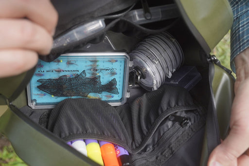 This 7.5 liter fully waterproof (IPX-7 rated) fly fishing sling pack with easy to use airtight zippers is large enough to carry your fishing gear for the day and probably a lunch as well. It is also small enough that you don't feel like you have a large backpack on one shoulder. It has comfortable and breathable padding for your back and shoulder so you can wear it all day. Some notable features: Fully waterproof and air tight. Medium sized 7.5 liter main compartment. Net holder slot on the face for long handled nets. Lots of gear clips on the bag and on the front strap. Comfortable padding were it's needed. Fits over left shoulder (great for you right handed casters). Gear straps to carry a fishing rod or rod tube, these straps are removable. Lots of side pockets in the main compartment to help organize. Also has a small front pocket on the face of the bag. Easy to swing to your front to access all your gear when needed. Specs for the NIRVANA Waterproof Fly Fishing Sling: Weight: 1.24 lbs (20 ounces) Compartment size: 8.7" wide x 14.6" tall x 4.3" deep 7.5 Liter compartment IPX-7 Waterproof rating